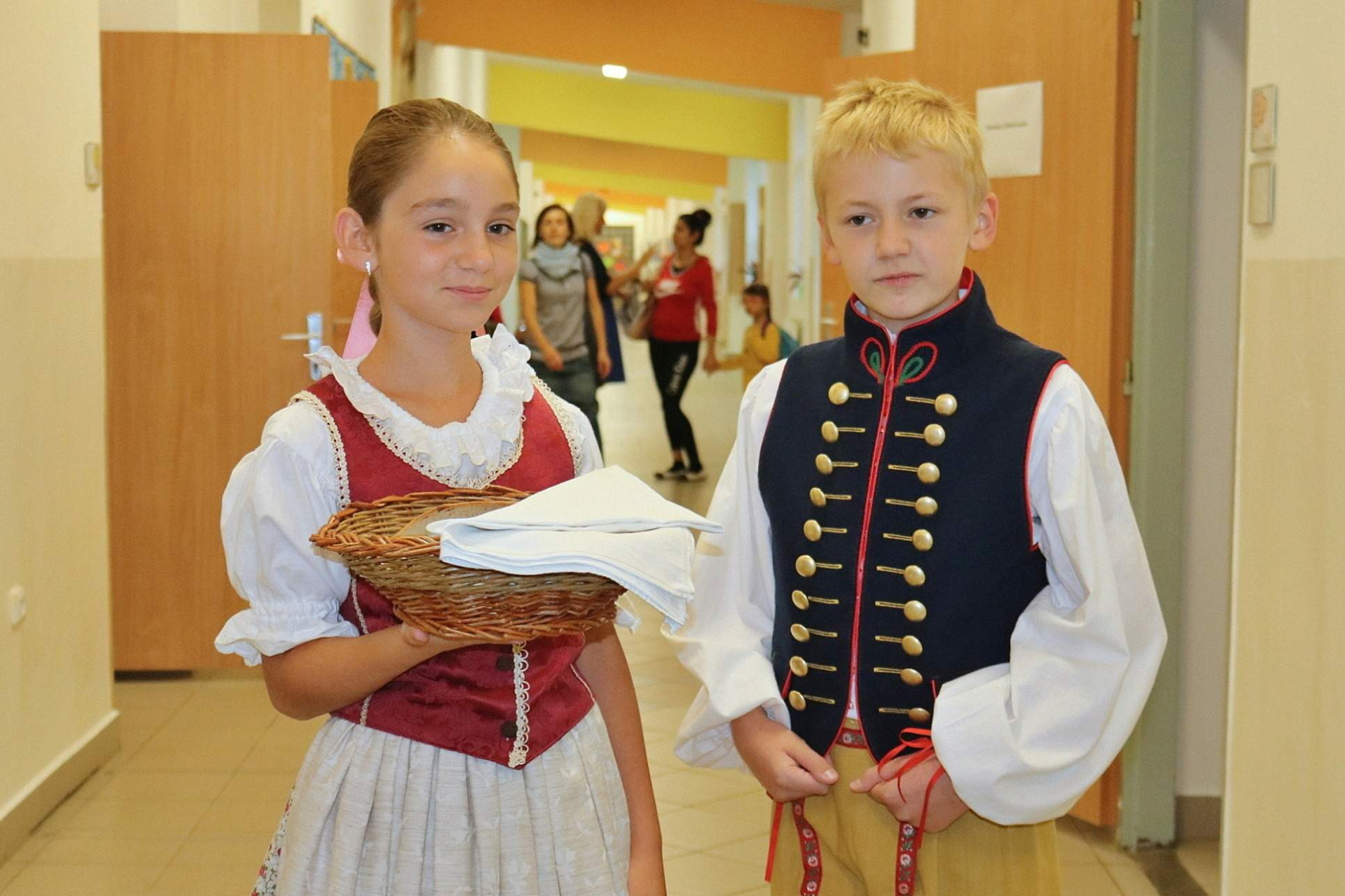 První školní den zavítala do naší školy vzácná návštěva - hejtman Pardubického kraje pan Netolický. S radostí jsme mu předvedli naše krásné kroje a přivítali ho chlebem a solí.